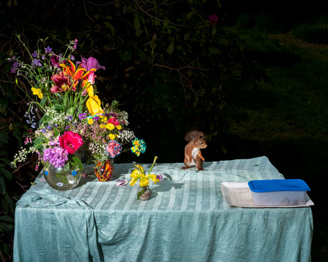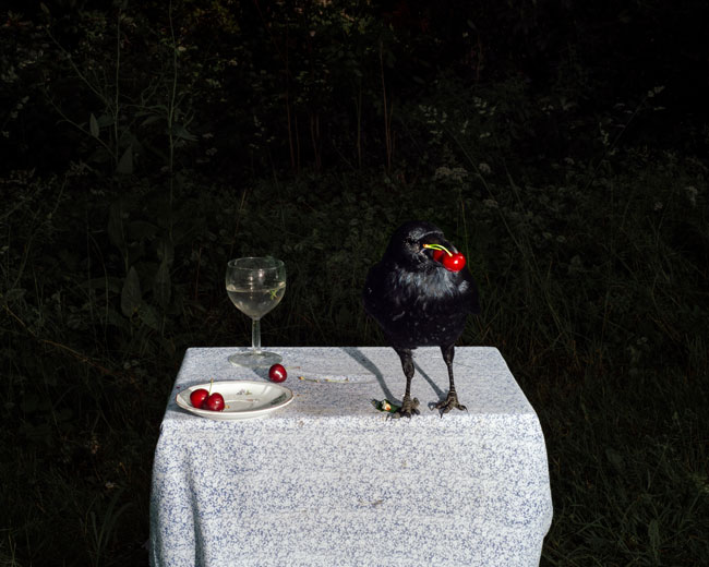 „Für meine neue Arbeit lade ich mich selbst zum Essen und Trinken in die Gärten und auf die Terrassen meiner Freunde ein. Die Gedecke auf dem Gartentisch werden durch mein Eingreifen zur Grundlage eines Stilllebens. Nachdem ich gegangen bin, bleibt eine Kamera als passiver Beobachter für einige Stunden oder ganze Tage zurück. Sie wird durch Bewegung ausgelöst, wenn Vögel oder wilde Tiere den Tisch besuchen. Auf diese Weise entstehen Bilder, bei denen nicht klar ist, ob es sich um eine dokumentierte Szene oder ein arrangiertes Stillleben handelt. Ich finde es faszinierend, das Inszenierte und das Zufällige in einem Bild zu verbinden.“