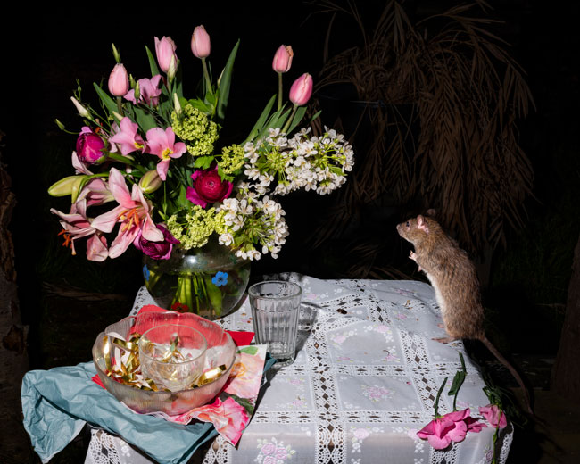 „Für meine neue Arbeit lade ich mich selbst zum Essen und Trinken in die Gärten und auf die Terrassen meiner Freunde ein. Die Gedecke auf dem Gartentisch werden durch mein Eingreifen zur Grundlage eines Stilllebens. Nachdem ich gegangen bin, bleibt eine Kamera als passiver Beobachter für einige Stunden oder ganze Tage zurück. Sie wird durch Bewegung ausgelöst, wenn Vögel oder wilde Tiere den Tisch besuchen. Auf diese Weise entstehen Bilder, bei denen nicht klar ist, ob es sich um eine dokumentierte Szene oder ein arrangiertes Stillleben handelt. Ich finde es faszinierend, das Inszenierte und das Zufällige in einem Bild zu verbinden.“
